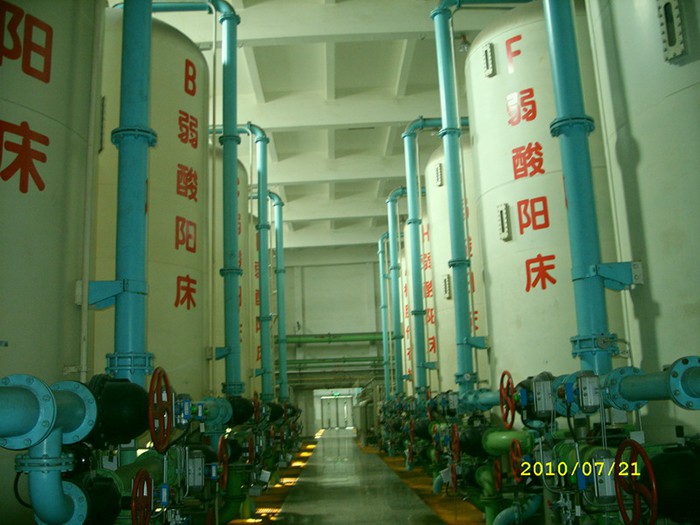 鋼襯膠混床,正常工作時(shí),陰陽(yáng)離子樹(shù)脂按一定比例合在一起進(jìn)一步去除水中溶解性離子,設(shè)計(jì)不同組合其出水電導(dǎo)可達(dá)到1~18M-cm 。均勻混合的樹(shù)脂層中,陽(yáng)樹(shù)脂與陰樹(shù)脂緊密地交錯(cuò)排列,每一對(duì)陽(yáng)樹(shù)脂與陰樹(shù)脂顆粒似于一組復(fù)床,混床就象無(wú)數(shù)組串聯(lián)運(yùn)行的復(fù)床。通過(guò)混合離子交換后進(jìn)入水中的氫離子與氫氧離子會(huì)立即生成電離度很低的水分子(H2O),很少可能形成陽(yáng)離子或陰離子交換時(shí)的反離子,因而能制取純度相當(dāng)高的成品水。